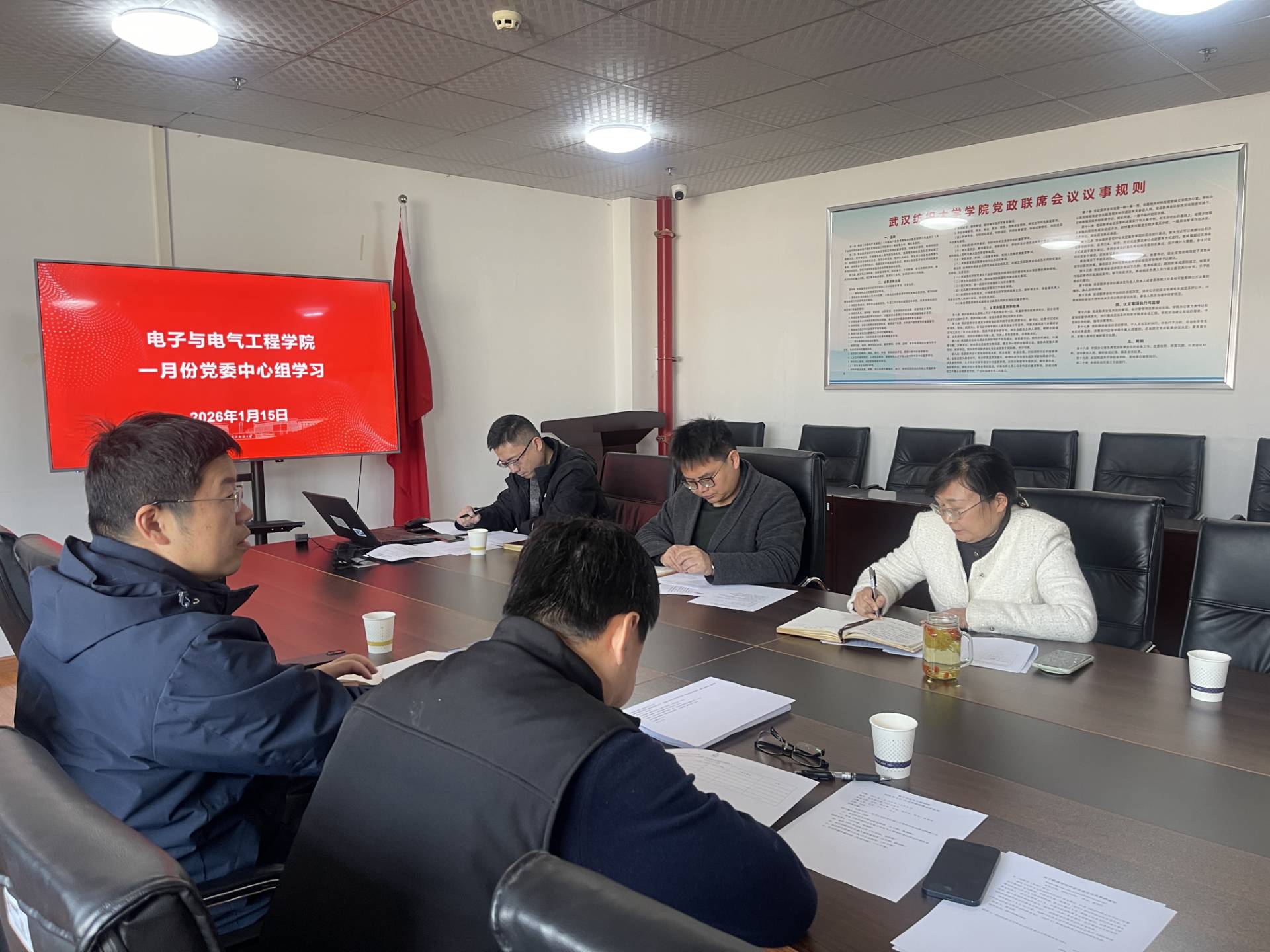 2026年1月15日,电子与电气工程学院在崇真楼南楼5033会议室召开一月份中心组学习会,专题学习《中共中央政治局召开民主生活会 中共中央总书记习近平主持会议并发表重要讲话》。学院党委书记张红鑫主持会议,全体班子成员参加。
