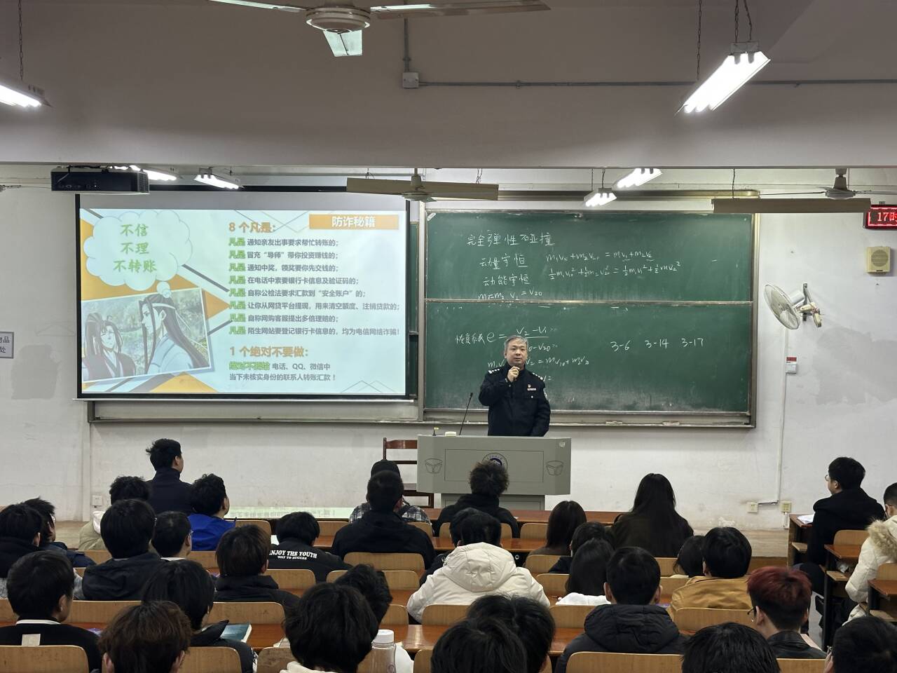为提升学生反诈防诈意识与自我保护能力,遏制电信网络诈骗案件发生,3月17日,电子电气学院邀请江夏公安分局庙山派出所开展反诈专题宣讲。庙山派出所所长邱波、学校保卫处副处长马绪亮出席,学院全体辅导员、本科生、研究生学生干部、寝室长参会。