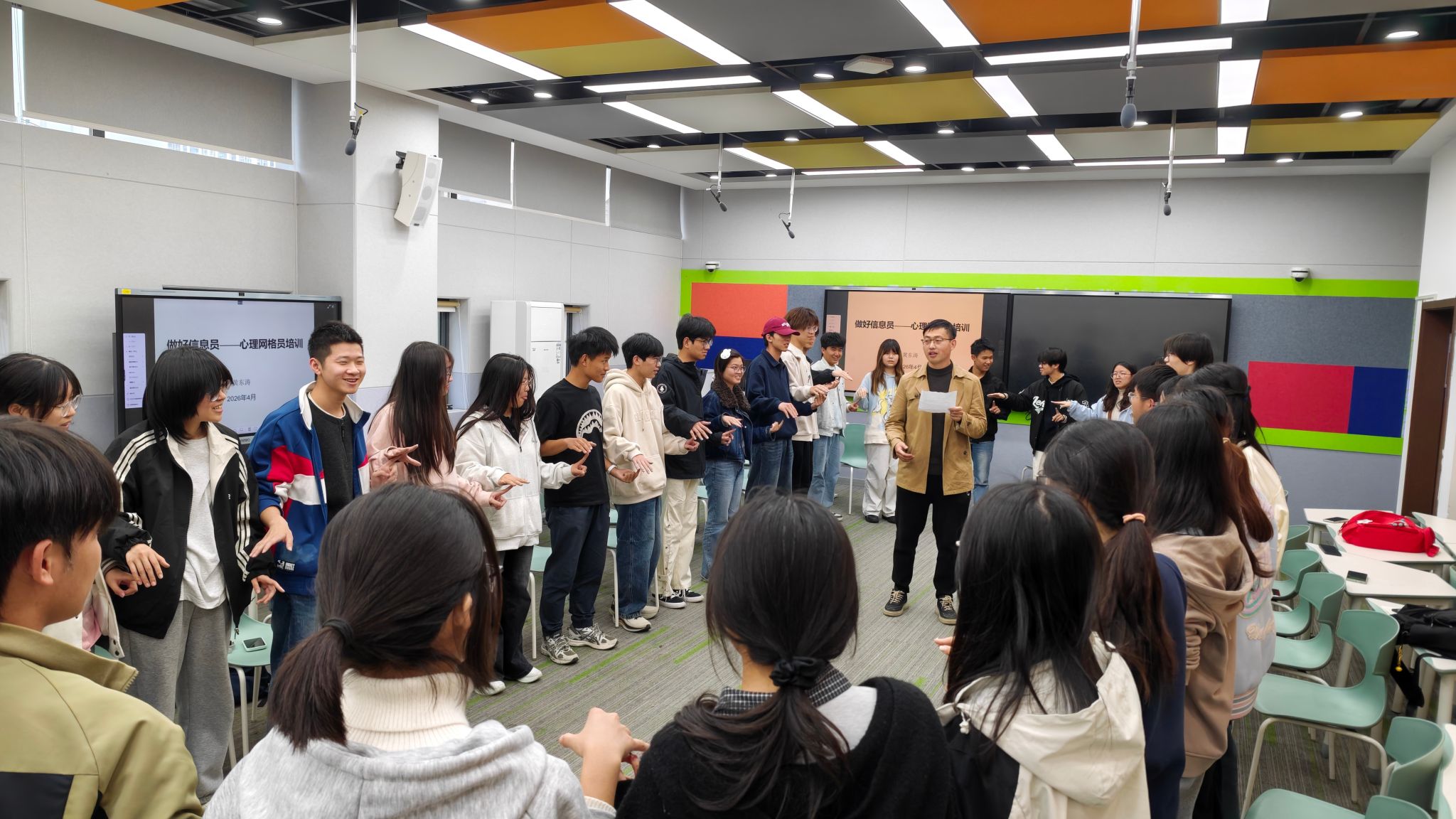 培训开始,黄东涛首先通过两项轻松的热身小游戏帮助在场同学快速放松身心,增进彼此熟悉度。随后,他将现场人员分为四个小组,引导大家围绕“抑郁症的常见症状有哪些”“为什么遇到异常情况要及时上报”“发现自身或他人出现明显心理异常时应如何规范报告”等话题展开充分讨论。各组依次选派代表分享讨论成果,黄东涛针对每组观点逐一进行细致点评与补充讲解。